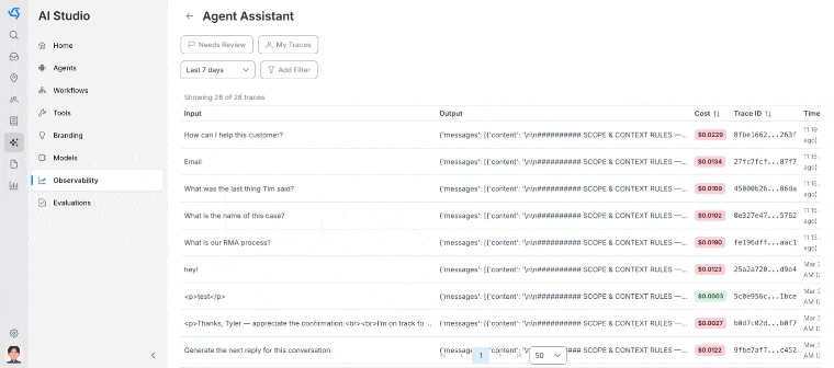 With OvationCXM’s AI Studio, every interaction is captured in a detailed trace, providing an auditable, step-by-step view of the agent's reasoning, the context used, and the final response. If a logic gap appears, you can see exactly where the agent diverged from the expected path.