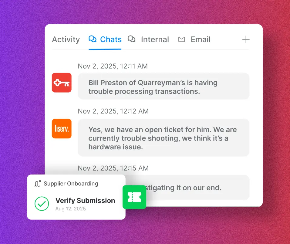 Get the latest updates on customer cases with your core or vendors in real time. Partner chat is built into the platform, so customers get answers faster and your team avoids endless emails and hold times.