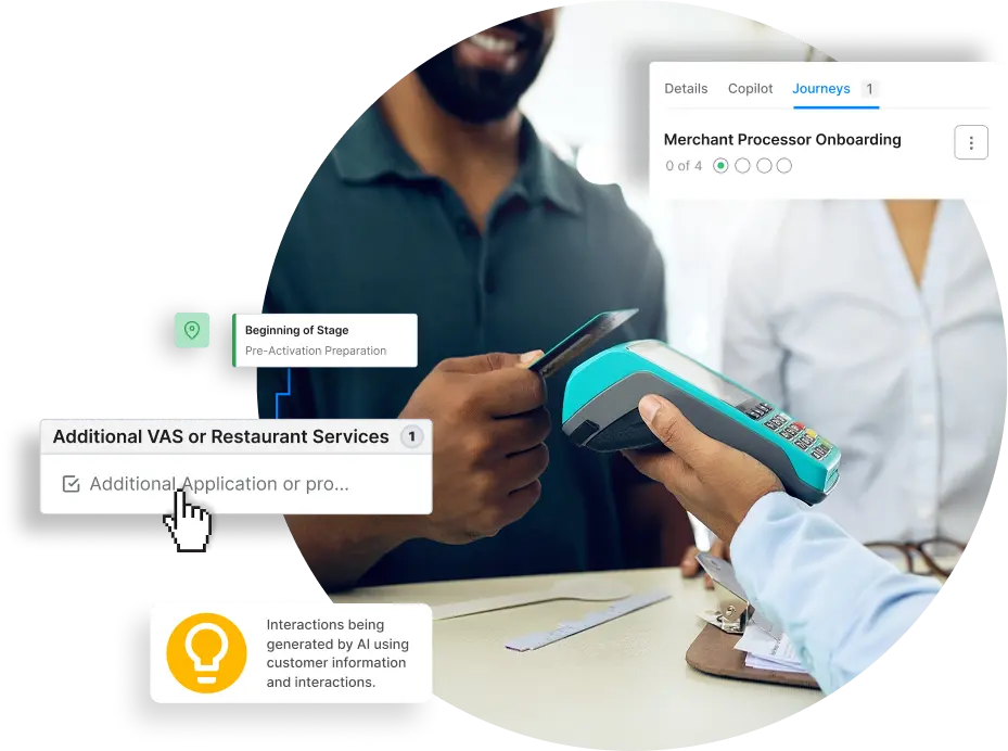 Manage and improve merchant onboarding and support journeys, across teams vendors and channels — with AI journey orchestration.